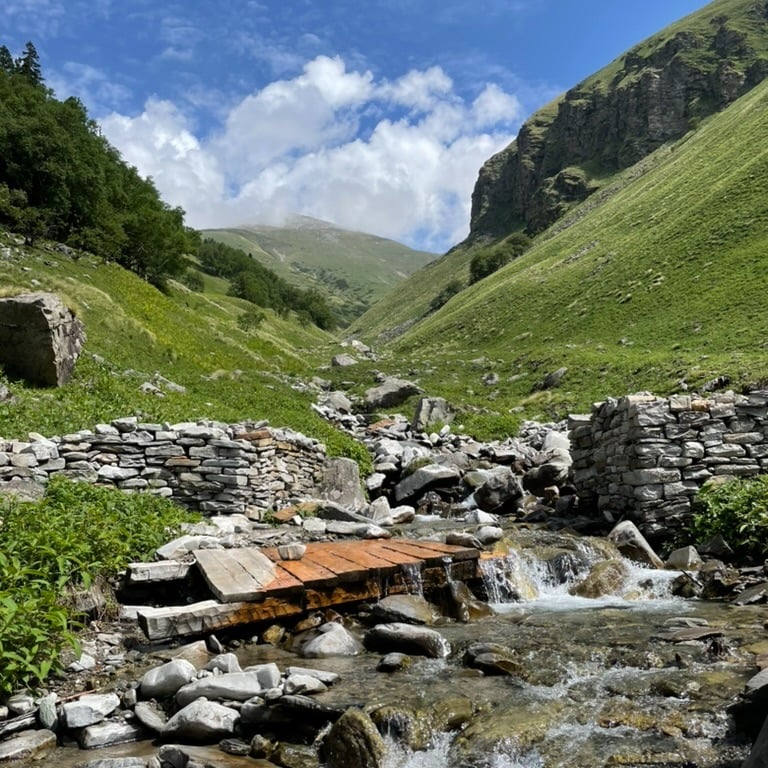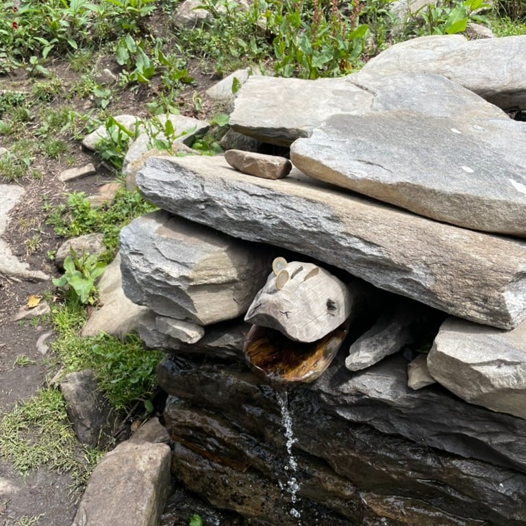 We paused at small streams to refill our water bottles. After a few more hours, the valley opened up, and we arrived at the Dayara Thatch campsite along the Pabbar River.
