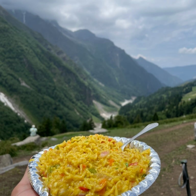 We continued our descent, losing a significant amount of altitude in a single day. Eventually, we reached a dhaba where I had egg Maggi again along with a cup of hot coffee.