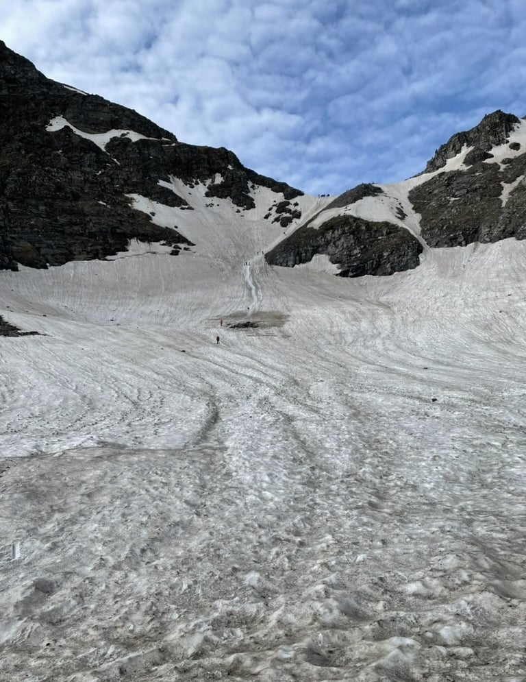 Slowly and steadily, I made my way to the top. Yayyy! I finally reached the pass. The view overwhelmed me — the clouds around the mountains and the snow fields stretched out everywhere.